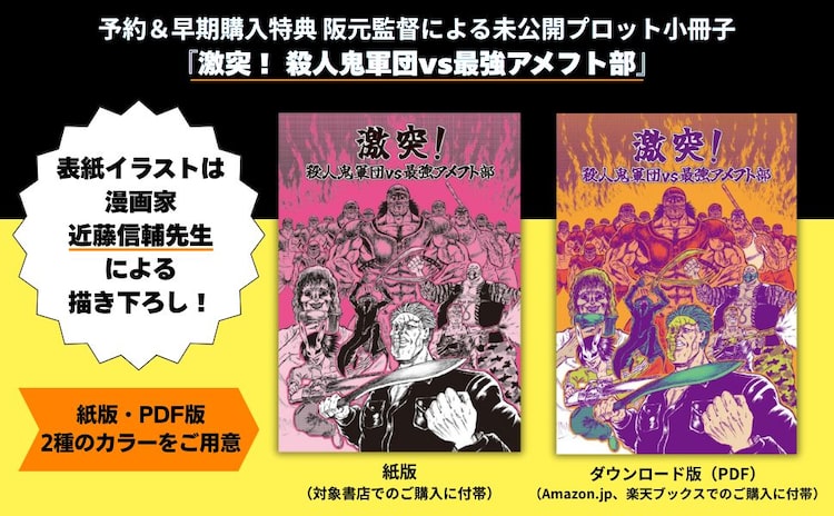 特典小冊子は書籍の予約・早期購入特典として付属するもの。阪元による未公開映画「激突! 殺人鬼軍団vs最強アメフト部」のプロットを収録している。阪元作品の大ファンだという近藤が、殺人鬼集団とアメフト部の凄烈なバトルが展開される同作のイメージイラストを手がけた。表紙の色が異なるPDF版と紙版を用意しており、8月14日までにAmazon.co.jpおよび楽天ブックスで購入するとPDF版がダウンロード可能。一部書店で購入すると紙版が付属する。紙版は在庫がなくなり次第終了となる。