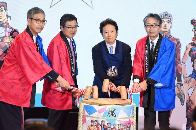 さらに今後、店舗に登場してほしいスタンドを問われると「体内に入るやつとかもいますので(笑)。難しいと思うけど、お願いします」とリクエスト。また普段料理をするという荒木はグッズにエプロンがあったらうれしいと微笑んでいた。オープニングセレモニーの最後は、荒木、バンダイナムコエクスペリエンスの川崎寛氏、PARCO代表取締役社長の川瀬賢二氏、集英社の常務取締役・瓶子吉久氏による鏡開きを実施。キービジュアルがプリントされた樽の蓋を景気よく開け、イベントを締めくくった。