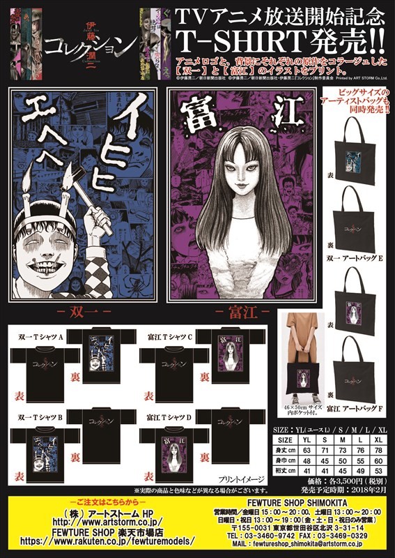 伊藤潤二原作によるテレビアニメ「伊藤潤二『コレクション』」をモチーフにしたTシャツが、アート・ストームより発売される。