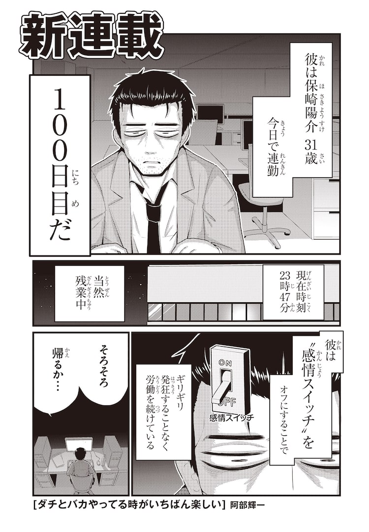 「ダチとバカやってる時がいちばん楽しい」の物語は、会社員男性・ホサが高校時代の友人・センドーと偶然に再会したことから開始。自分は仕事終わりで疲れ切っているのに、七輪と炭、肉というこれから焼き肉をする気満々のセットを抱えたセンドーを見たホサは、100連勤のつらさを乗り切るためオフにしていた“感情スイッチ”が思わずオンになり号泣してしまう。そこから一緒に焼き肉パーティをすることになったおじさん2人が、明日のことなど考えずハメを外す様子が第1話では描かれる。