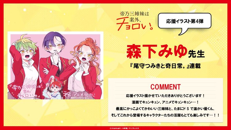 ひらかわあや原作によるTVアニメ「帝乃三姉妹は案外、チョロい。」の応援イラスト企画第4弾として、森下みゆのイラストとコメントが公開された。