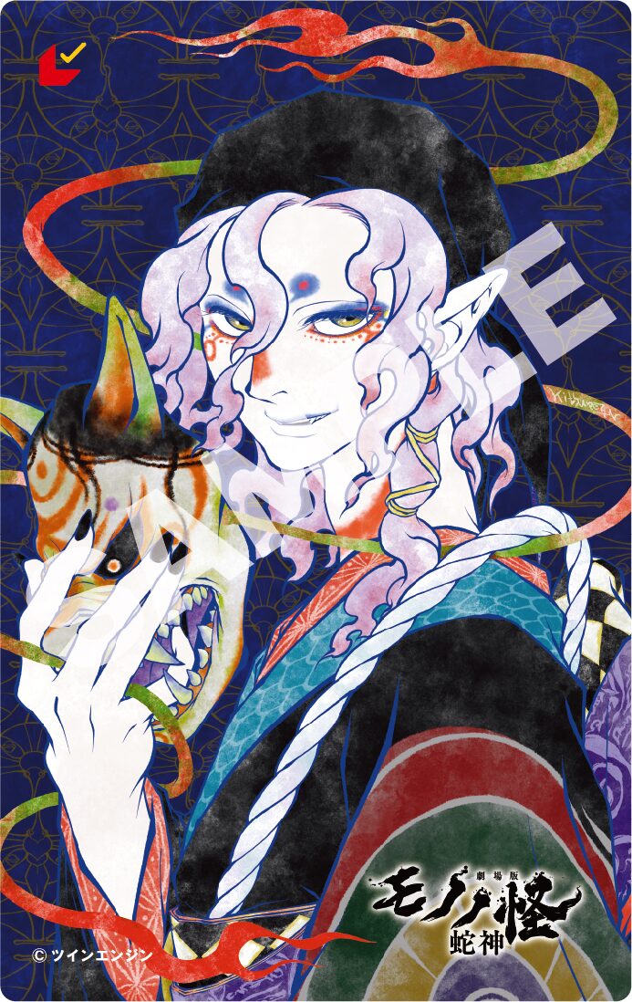 2026年春に全国公開される「劇場版モノノ怪 第三章 蛇神」は「劇場版モノノ怪」シリーズの最終章。第2弾ムビチケカードにはキャラクターデザインを務める永田狐子が、主人公・薬売りを妖艶なタッチで描き下ろした。犬歯をちらつかせながら微笑む薬売りが、彼が戦闘時に切り替わる姿である神儀をモチーフにしたお面を手にしている。