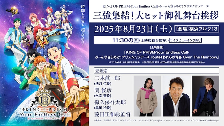 劇場アニメ「KING OF PRISM-Your Endless Call-み~んなきらめけ!プリズム☆ツアーズ」およびラージフォーマット版「も~っとつながる!KING OF PRISM-Your Endless Call-み~んなきらめけ!プリズム☆ツアーズ」の舞台挨拶が、8月23日に神奈川・横浜ブルク13で開催される。舞台挨拶には法月仁役の三木眞一郎、氷室聖役の関俊彦、黒川冷役の森久保祥太郎、菱田正和総監督が登壇する。