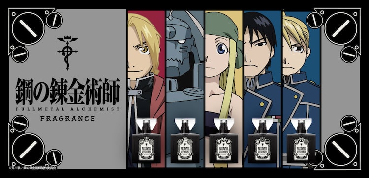 荒川弘原作によるアニメ「鋼の錬金術師 FULLMETAL ALCHEMIST」に登場するエド、アル、ウィンリィ、ロイ、ホークアイをイメージした香水が、キャラクターフレグランスブランド・primaniacsから発売される。