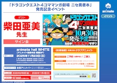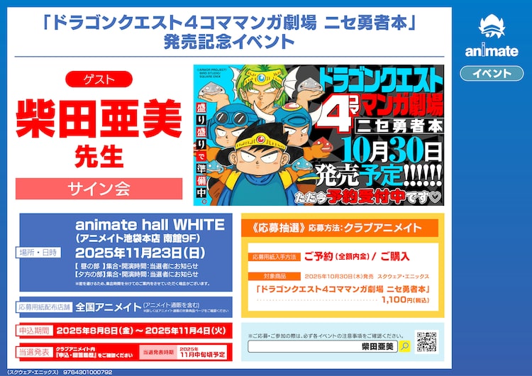 「ドラゴンクエスト4コママンガ劇場 ニセ勇者本」は、柴田の過去の4コマ作品と、SNSに掲載された令和の新作や描き下ろし4コマをまとめた1冊。サイン会への参加は抽選制で、応募には全国のアニメイトもしくはアニメイト通販で単行本を予約もしくは購入した人を対象に配布されるシリアル応募券が必要となる。申し込み期間は本日8月8日から11月4日まで。当落通知は11月中旬に予定されている。なお「ドラゴンクエスト4コママンガ劇場 ニセ勇者本」が刊行される10月30日には、HD-2D版「ドラゴンクエスト1&2」も同時発売となる。