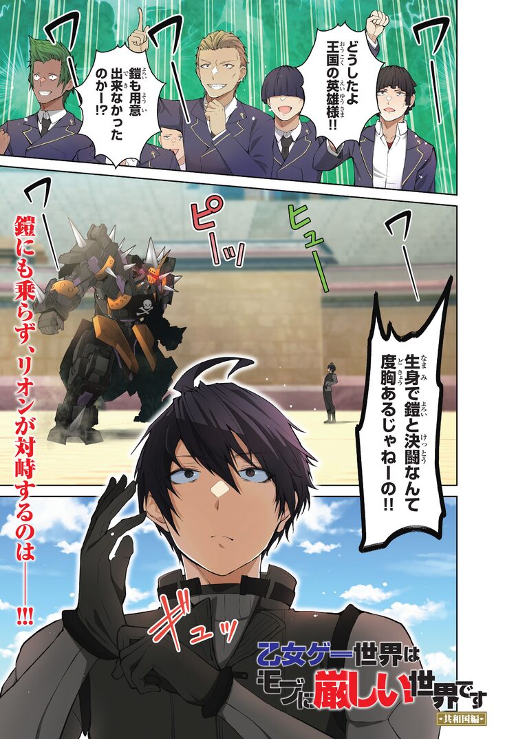「乙女ゲー世界はモブに厳しい世界です【共和国編】」は、三嶋与夢の小説を原作としたコミカライズ作品。作画は行々狸が担当している。女尊男卑が甚だしい乙女ゲーム世界に転生してしまった主人公リオンは、アンジェリカとオリヴィエという2人の婚約者を得て、平穏な人生を送れるはずだった。しかしゲームにはリオンの知らなかった続編が存在し、世界の危機を救うべく2作目の舞台・アルゼル共和国へと向かうことになる。
