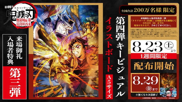 吾峠呼世晴原作による「劇場版『鬼滅の刃』無限城編 第一章 猗窩座再来」の来場御礼入場者特典第3弾としてA5サイズの「第4弾キービジュアル イラストボード」の配布が決定した。