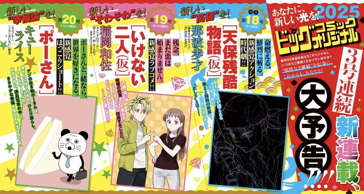 これは本日8月20日発売の同誌17号で告知されたもの。9月5日発売の18号では那波によるアクション時代劇「天保残酷物語(仮)」が開幕する。また9月20日発売の19号では「犯人クン、何してんの?」の稲岡和佐によるラブコメ「いけない二人(仮)」、10月3日発売の20号では「ネコノヒー」のキューライスによるショート「ポーさん」の連載が開始となる。