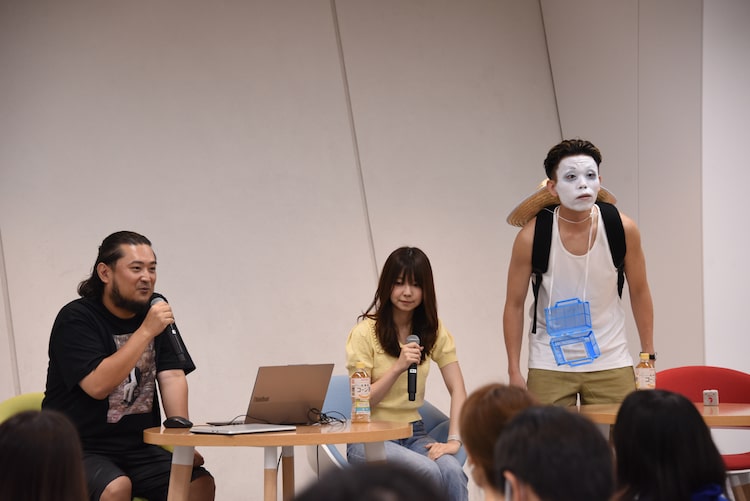「うしろの正面カムイさん」のトークショーには原作者のえろき、作画担当のコノシロしんこ、担当編集の成田卓哉氏が登壇。えろきはマンガワンの公式YouTubeチャンネルで公開されているドキュメンタリー番組「ウラ漫 ―漫画の裏側密着―」に登場した際のように、虫取り網を手に持ち、麦わら帽子にタンクトップ姿、そして顔面白塗りで現れ、客席をざわつかせる。その後、トーク中に白塗りのメイクを落としながら普段着に着替えたえろきは「『ウラ漫』を観てくださった方が来たときに、普通に出てきたらそれはそれでがっかりしてしまうかなと。以前の自分を超えろということで、アドオンしました」とファンサービス精神を明かした。