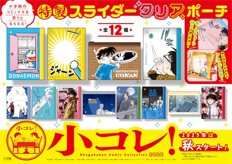 今回の「小コレ!」では、好きな小学館の単行本を1冊購入するごとに1点、ノベルティの「特製スライダークリアポーチ」をプレゼント。ポーチはクリア素材で「ドラえもん」「名探偵コナン」「葬送のフリーレン」「ミステリと言う勿れ」「チ。 ―地球の運動について―」など12種の絵柄が用意された。こだわりのデザインで制作されたポーチは、中に何を入れるかでアレンジも自由自在。ボールチェーン付きで持ち運びにも便利なアイテムとなっている。
