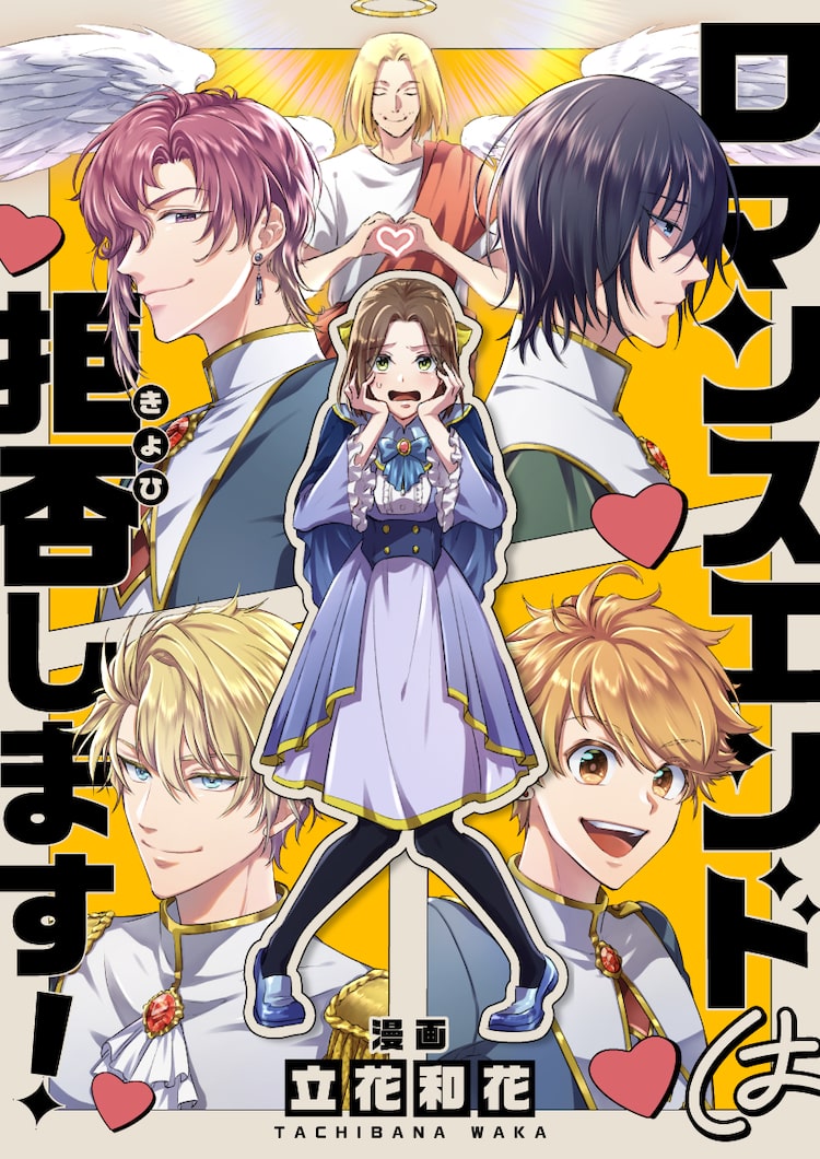「ロマンスエンドは拒否します!」の主人公・朋は、愛犬・さくらと暮らす平凡な会社員だった。しかし交通事故で命を落とし、神様から望まぬ転生を強いられてしまう。愛犬のことが心配な朋はどうにか生き返ることはできないかと食い下がり、異世界で“恋愛ポイント(LP)”を集めれば生き返れるという約束を神様と交わす。恋愛脳の神が創造した乙女ゲーム世界を攻略することになった朋だが、困ったことに彼女は恋愛にまったく興味がない。なんとか恋愛をしないでポイントを集められないかと頭を悩ませる彼女の前に、次々と現れる攻略対象。ラブコメを押し付けられたヒロインの異世界生活がスタートする。
