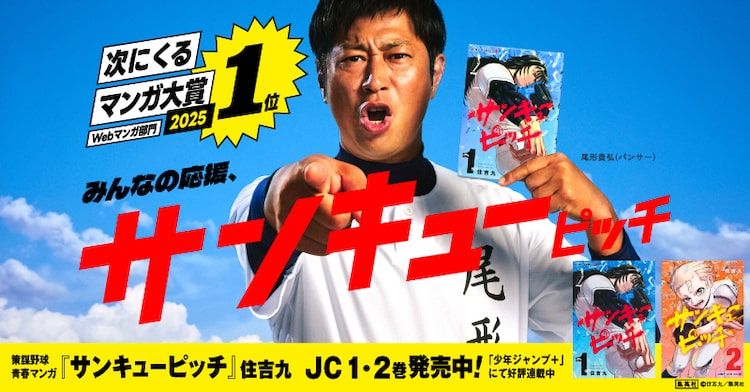 住吉九「サンキューピッチ」が「次にくるマンガ大賞2025」Webマンガ部門の第1位を受賞。これを記念して、パンサーの尾形貴弘を起用した“感謝広告”が、本日9月19日より展開されている。