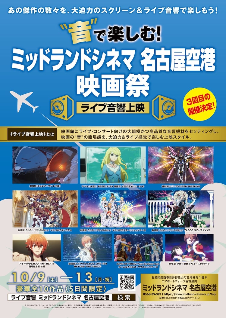 「“音”で楽しむ!ミッドランドシネマ 名古屋空港映画祭≪ライブ音響上映≫」は、ライブ用の大型スピーカーによる上質な音響で映画を鑑賞できるイベント。上映作品には本日9月19日に公開された劇場版「チェンソーマン レゼ篇」をはじめ、「ヤマトよ永遠に REBEL3199 第四章 水色の乙女(サーシャ)」「機動戦士ガンダムSEED FREEDOM」「劇場版 うたの☆プリンスさまっ♪ マジLOVEキングダム」「劇場版 うたの☆プリンスさまっ♪ マジLOVEスターリッシュツアーズ」「劇場版 うたの☆プリンスさまっ♪ TABOO NIGHT XXXX」「アイドリッシュセブン First BEAT! 劇場総集編 前編」「劇場版アイドリッシュセブン LIVE 4bit BEYOND THE PERiOD」「KING OF PRISM-Your Endless Call-み~んなきらめけ!プリズム☆ツアーズ」「劇場版 少女☆歌劇 レヴュースタァライト」の10作品がラインナップされた。チケットは明日9月20日11時より劇場窓口とWebで販売される。