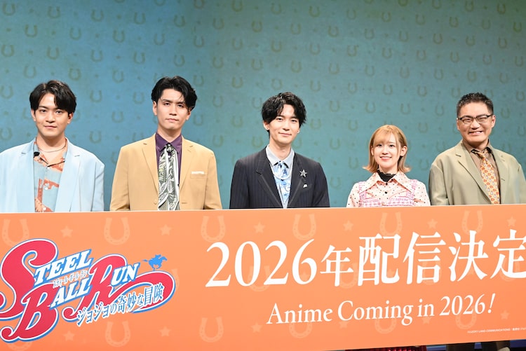 荒木飛呂彦原作によるアニメ「スティール・ボール・ランジョジョの奇妙な冒険」の新情報解禁イベントが、本日9月23日に東京・竹芝ポートホールで行われ、ジョニィ・ジョースター役の坂田将吾、ジャイロ・ツェペリ役の阿座上洋平、ディエゴ・ブランドー役の石川界人、ルーシー・スティール役の高橋李依、スティーブン・スティール役の三宅健太が登壇した。