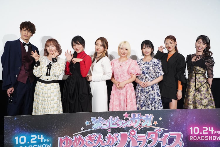 劇場版「ゾンビランドサガ ゆめぎんがパラダイス」の完成披露上映会が、去る9月28日に東京・新宿バルト9で開催。巽幸太郎役の宮野真守、源さくら役の本渡楓、二階堂サキ役の田野アサミ、水野愛役の種田梨沙、紺野純子役の河瀬茉希、ゆうぎり役の衣川里佳、星川リリィ役の田中美海、山田たえ役の三石琴乃が登壇し、初めて全キャストが集結した。