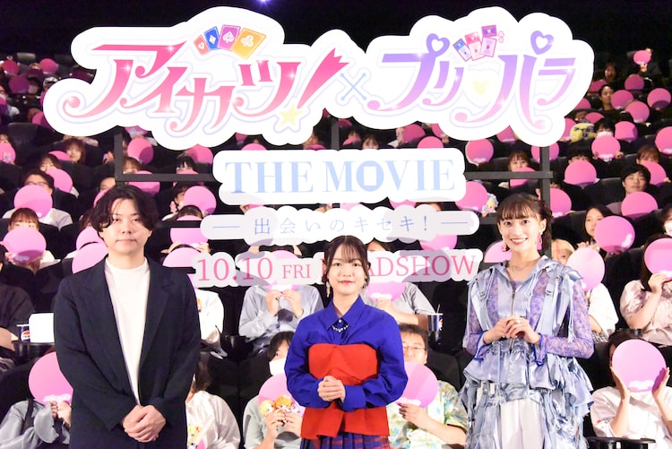 劇場アニメ「アイカツ!×プリパラ THE MOVIE -出会いのキセキ!-」の完成披露上映会が、本日9月29日に東京・新宿バルト9で開催された。上映後に行われた舞台挨拶には、大空あかり役の下地紫野、真中らぁら役の茜屋日海夏、大川貴大監督が登壇した。