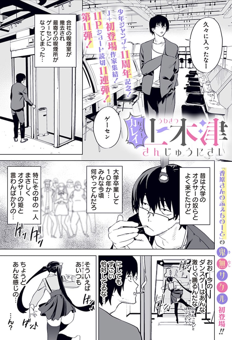 「カレイなる!上木津さんじゅうにさい」は、くたびれたサラリーマン・野照が、大学時代のオタクサークル仲間でオタサーの姫だった上木津をゲームセンターで目撃するところから始まる。自分のことなどもう覚えていないだろうと声はかけずにやり過ごそうとする野照だったが、上木津のほうから近づいてきて……。少年ジャンプ+11周年を記念して、同サイト初登場作家陣による11ページの読み切りを11作配信する企画のラストを飾る作品だ。