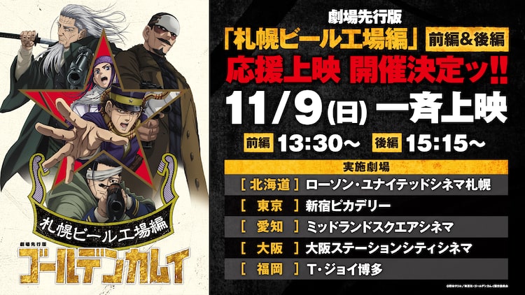 野田サトル原作による「劇場先行版 アニメ『ゴールデンカムイ』札幌ビール工場編」前後編の応援上映が、11月9日に開催される。