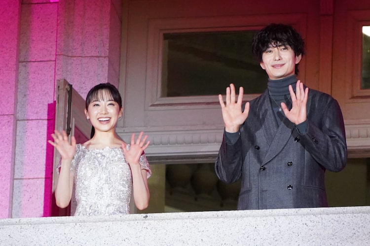 11月21日に公開を控えた「果てしなきスカーレット」。イベントは19年前に公開された細田監督の作品「時をかける少女」にも登場した東京・東京国立博物館で行われた。バルコニーに現れた芦田と岡田は、スカーレットの髪色を思わせるピンクのペンライトを持った観客たちに迎えられ、笑顔で手を振る。その後レッドカーペットに降り立った2人とともに、キャスト陣と細田監督が登壇した。
