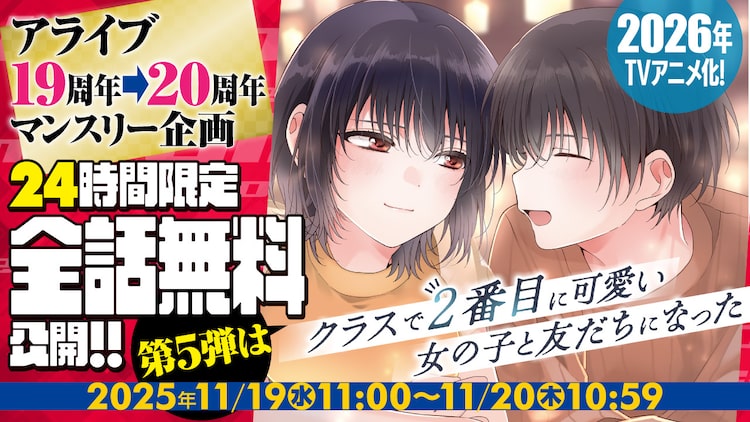 無料公開は月刊コミックアライブ(KADOKAWA)の創刊19周年を記念した企画の一環だ。なお「クラスで2番目に可愛い女の子と友だちになった」の単行本は6巻まで発売中で、最新7巻は12月26日に刊行予定。