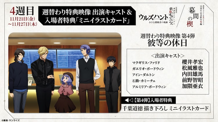10月31日より劇場にて4週間限定上映されてる「特別編集版『機動戦士ガンダム 鉄血のオルフェンズ ウルズハント -小さな挑戦者の軌跡-』同時上映『機動戦士ガンダム 鉄血のオルフェンズ」10周年記念新作短編『幕間の楔』」の新たな週替わり特典映像と入場者特典が公開された。
