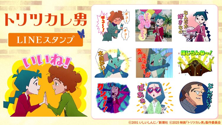 「トリツカレ男」は公園で風船を売るペチカに一目惚れをした“トリツカレ男”ことジュゼッペが主人公のラブストーリー。11月より上映されている。LINEスタンプにはネズミ語で「チュ~」と相棒のハツカネズミ・シエロと会話するジュゼッペや、ジュゼッペとペチカの出会いの場面、ツイスト親分の「信じらんね~!」という叫び、さらにサングラスをかけたペチカの母や、タタンなど多数の登場キャラクターのものが用意された。