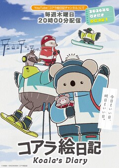 アニメ「コアラ絵日記」チャンネルで配信中の「コアラ絵日記」は、コアラさんの優しくて温かい日常を描く物語。2026年1月のvol.1は、1月8日20時より配信される。キャラクターデザイン・原千遥による描き下ろしキービジュアル第2弾には、コアラさんとくまちゃん、カラスさんらが、仲良くスキーを楽しむ一幕が収められた。キービジュアルの紹介動画も公開されている。また1月からの主題歌は、ぷにぷに電機 feat. Kan Sanoによる「虹と」をアレンジした「Swing ver.」に決定した。