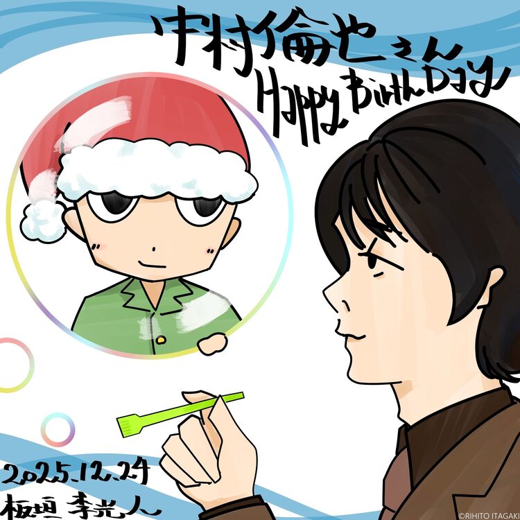 板垣はたびたび、アフレコ時の中村のさりげないサポートに感謝を述べており、映画のプロモーション活動を通して中村との親交も深まっていった。そんな中村の誕生日に向け、板垣が「お祝いがしたい」とバースデーイラストを提案。これに原作者・武田も呼応し、板垣と武田がぞれぞれ中村のバースデーイラストを描き下ろすに至った。板垣は、作中で田丸と吉敷がシャボン玉で遊ぶ印象的なシーンから着想を得た中村の姿を柔らかいタッチで描写。誕生日となるクリスマスイブにちなみ、サンタ帽をかぶる吉敷の微笑ましい姿も添えられている。武田は、精悍に並び立つ吉敷と中村のイラストで祝福した。