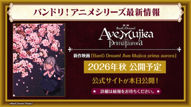 「BanG Dream!(バンドリ!)」プロジェクトのひとつであるAve Mujicaの新作映画のタイトルが「BanG Dream! Ave Mujica prima aurora」に決定。2026年秋に公開される。併せてティザービジュアルがお披露目された。