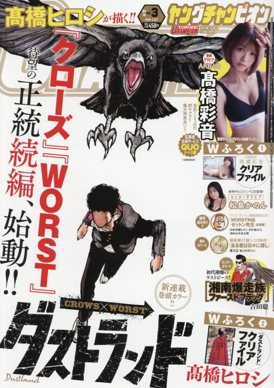 「クローズ」「WORST」の正統続編として描かれる「ダストランド」。坊屋春道、月島春らの活躍から時は経ち、カラス群がる“吹き溜まりの地”で新たな物語が始まる。母を亡くし、父とともにとある団地へと引っ越してきた少年・ヒバリは……。なお今号には「ダストランド」のイラストを使用したクリアファイルが封入された。