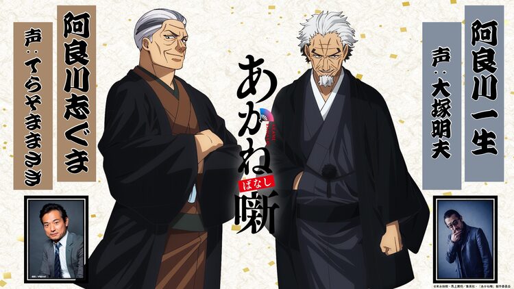 てらそま演じる志ぐまは主人公・朱音の父である志ん太の師匠。朱音も弟子入りすることになる阿良川四天王の一角で、人情噺の名手として“泣きの志ぐま”と評されるキャラクターだ。大塚演じる一生は、柏家、三明亭に続く江戸落語界の三極のひとつ「阿良川一門」のトップ。志ぐまの兄弟子、そして魁生の師匠にあたるキャラクターだ。
