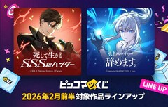 ピッコマが展開するオンラインくじ・ピッコマくじの新たなランナップが公開。本日2月4日より「死して生きるSSS級ハンター」、2月13日より「勇者パーティー辞めます。」のグッズが当たるくじが販売される。