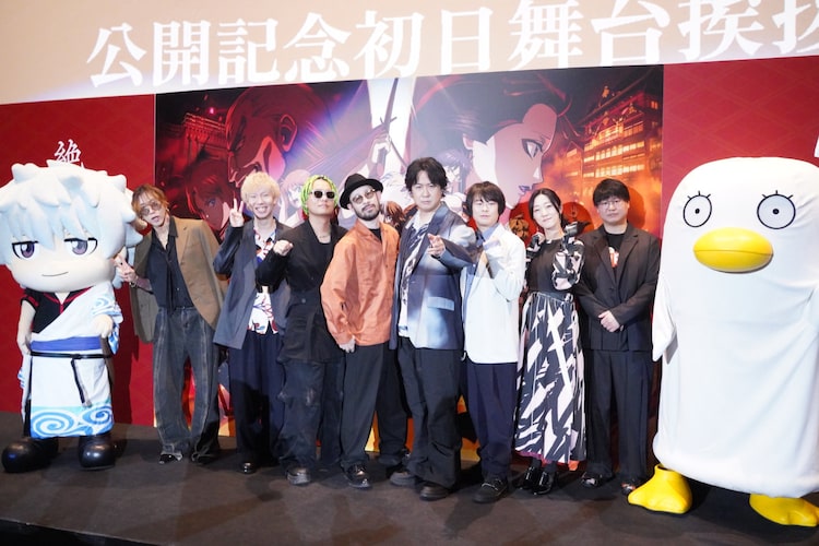空知英秋原作による「新劇場版 銀魂 -吉原大炎上-」の公開初日舞台挨拶が本日2月13日に東京・新宿バルト9で開催され、坂田銀時役の杉田智和、志村新八役の阪口大助、神楽役の釘宮理恵、安藤尚也監督、主題歌を務めたSUPER BEAVERが登壇した。