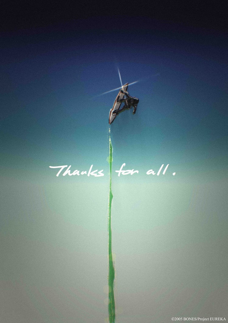 2005年4月より放送され、2025年から20周年プロジェクトとしてさまざまな企画が展開されている「交響詩篇エウレカセブン」。シンプルな構図のお祝いイラストには、中央に「Thanks for all.」という文字も配置された。東京・代官山UNITで4月3日に開催される「交響詩篇エウレカセブン 20th anniversary party club gekko state」にはDJのKo Kimura、Jun Inagawa、Hiroshi Watanabe、さらに☆Taku Takahashiが出演する。