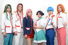 ミュージカル「少女革命ウテナ~白き薔薇のつぼみ~」囲み取材の様子。左から横井翔二郎扮する西園寺莢一、戸谷公人扮する桐生冬芽、能條愛未(乃木坂46)扮する天上ウテナ、山内優花扮する姫宮アンシー、大崎捺希扮する薫幹、立道梨緒奈扮する有栖川樹璃。