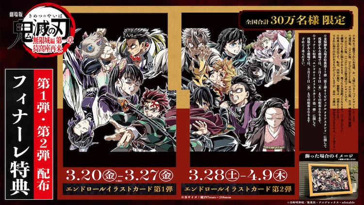 ファイナルPV第2弾には、鬼殺隊の面々が戦う姿を収録。フィナーレ特典は、エンドロールイラストをA4サイズにプリントした「エンドロールイラストカード」に決定した。3月20日から27日まで配布される第1弾のカードに描かれたのは竈門炭治郎、嘴平伊之助、栗花落カナヲ、胡蝶しのぶ、悲鳴嶼行冥。3月28日から4月9日まで配布される第2弾には、竈門禰󠄀豆子、我妻善逸、不死川玄弥、冨岡義勇、時透無一郎、甘露寺蜜璃、伊黒小芭内、不死川実弥が収められた。部数は全国合計30万人分で、なくなり次第配布を終了する。