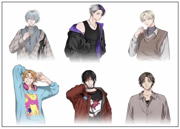 「Soul of Sole」キャラクター。上段左から律儚碧生、智歌崎湊、Zii。下段左から霓音瑠星、鼓志貫颯真、ユウリ