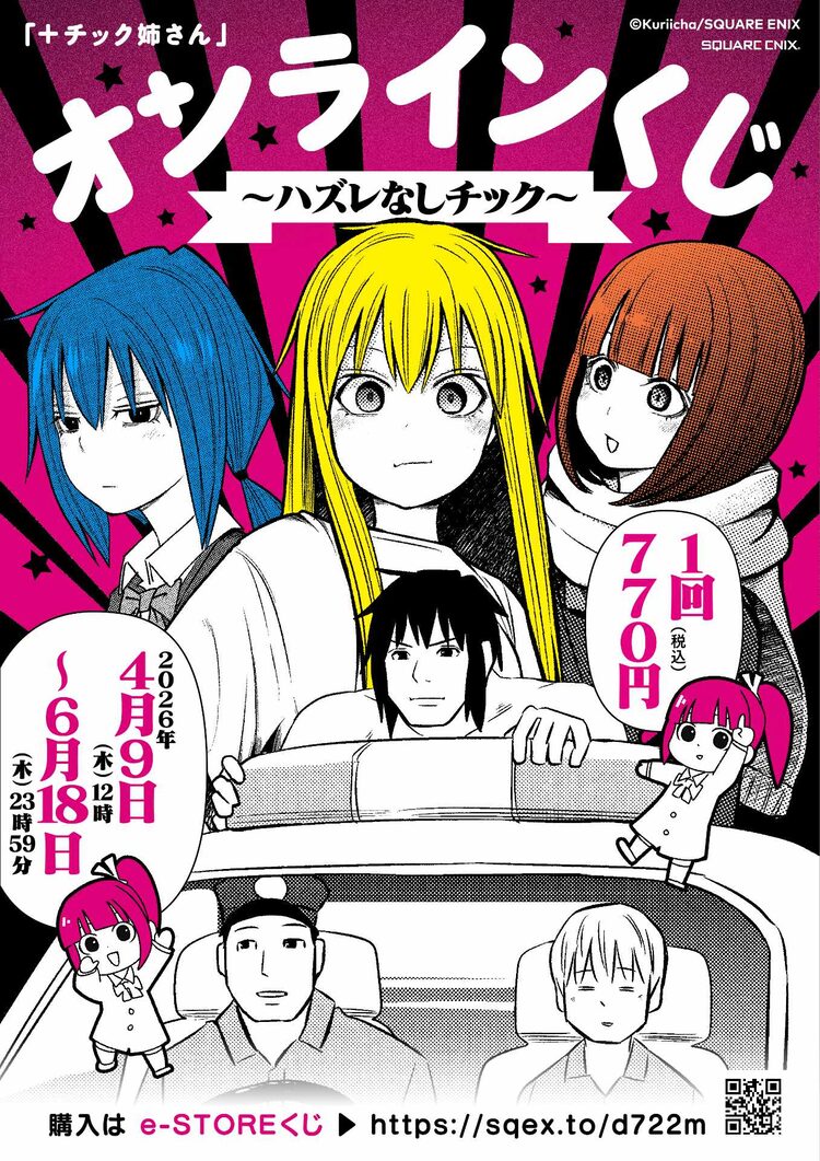 栗井茶「+チック姉さん」のオンラインくじ「『+チック姉さん』オンラインくじ~ハズレなしチック~」が、スクウェア・エニックスのe-STOREに登場。本日4月9日から6月18日まで販売されている。価格は1回税込770円。