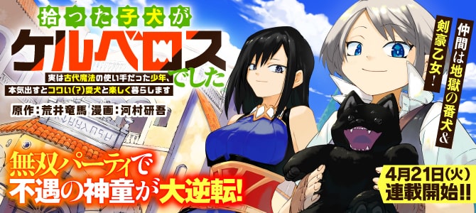 荒井竜馬原作による河村研吾の新連載「拾った子犬がケルベロスでした~実は古代魔法の使い手だった少年、本気出すとコワい(?)愛犬と楽しく暮らします~」が、本日4月21日にアルファポリスでスタートした。