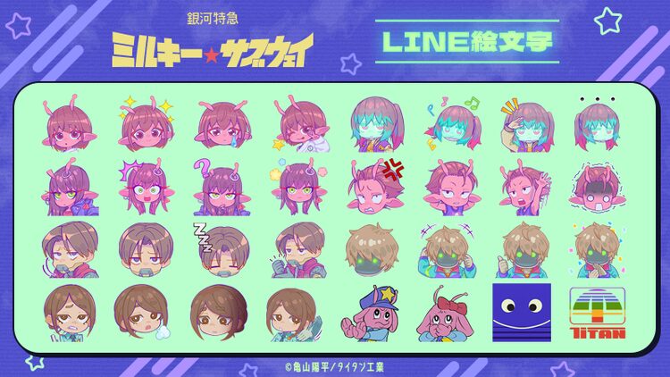 「ミルキー☆サブウェイ」LINE絵文字にカート、マックス、ポッピーくんも登場 2026年4月29日2026年4月29日 editor LINE絵文字「銀河特急 ミルキー☆サブウェイ」アニメ「銀河特急 ミルキー☆サブウェイ」のLINE絵文字が、スタンプショップにて100LINEコイン、LINE STOREにて250円で販売されている。 絵文字にはピースするチハル、ビシッと敬礼のようなポーズをするマキナなどをラインナップ。また不満げな表情のカートや、親指を立てるマックス、さらに険しい表情のポッピーくんの絵文字も登場した。 (c)亀山陽平/タイタン工業 関連記事YUMA(&TEAM)の人生を変えたアニメ「HUNTER×HUNTER」劇場版「暗殺教室」のLINEスタンプ&着せかえ、「面白いじゃん」と業がニヤリ「ドラフトキング」岐路に立つ選手と郷原を映し出す予告映像、ポスタービジュアル公開アニメ「カリスマ」は2027年1月から放送、カリスマたちが身を寄せ合うビジュアル公開「忍たま乱太郎」のイベント「Sakura祭」のキービジュアル公開 ミニキャライラストも壮絶な復讐サスペンス「十字架のろくにん」完結巻発売記念の一気読みキャンペーン Tweet 関連コミック 銀河特急 ミルキー☆サブウェイ