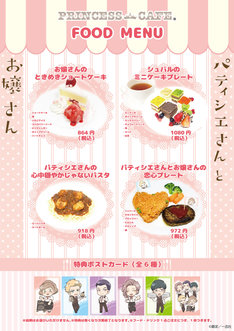 店内では「お嬢さんのときめきショートケーキ」「パティシエさんの心中穏やかじゃないパスタ」「パティシエさんとお嬢さんの恋心プレート」など作品をイメージしたフードやドリンクなどをラインナップ。1品オーダーするごとに、全6種のポストカードがランダムで1枚進呈される。またアクリルキーホルダーや缶バッジ、ビッグアクリルスタンドといったグッズも用意された。なおコラボカフェのほか、プリンセスショップ札幌館と福岡館ではコラボドリンクショップも限定オープンする。