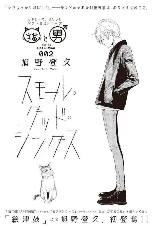 「IN THE APARTMENT」「モアザンワーズ」などで知られる絵津鼓。今号では旭野登久として一般誌に初登場し、「スモール・グッド・シングス」というタイトルの読み切りを執筆した。物語の主人公は探偵事務所で働く青年・椎熊。上司と猫と過ごしていた事務所で、ある日椎熊は「好きなのか?」と、知らないおじさんに声をかけられ……。