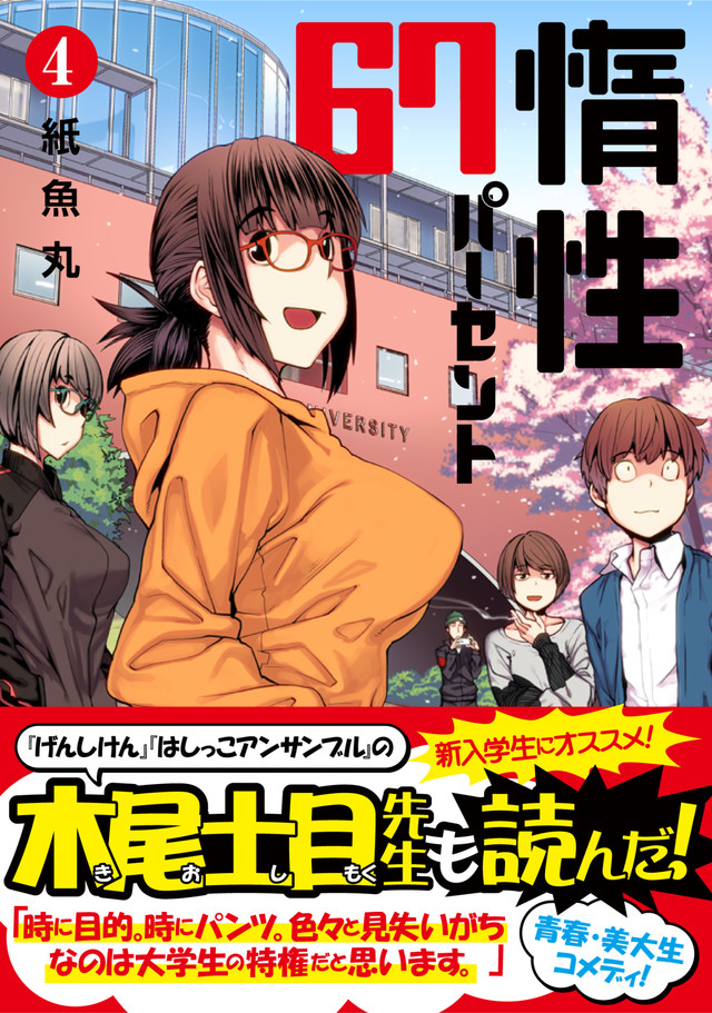 紙魚丸「惰性67パーセント」の4巻が、本日4月19日に発売された。4巻の帯には「げんしけん」「はしっこアンサンブル」の木尾士目が、「時に目的。時にパンツ。色々と見失いがちなのは大学生の特権だと思います。」と推薦コメントを寄せている。