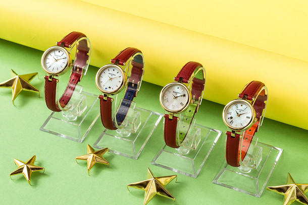 ラインナップされたのは、MARGINAL#4の楽曲「100万回の愛革命(REVOLUTION)!」のメンバー衣装をイメージした腕時計。桐原アトム、藍羽ルイ、野村エル、野村アールの4種類が用意され、12時を示すインデックスとベルトの裏地は各メンバーをイメージしたカラーで彩られた。また文字盤にも、それぞれの衣装のモチーフが装飾としてあしらわれている。価格は各1万3824円。予約は本日5月9日から28日まで受け付け、商品は10月上旬頃に届けられる。