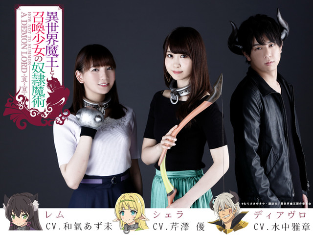 「異世界魔王と召喚少女の奴隷魔術」はむらさきゆきやによる異世界ファンタジー小説を原作とした作品。MMORPG「クロスレヴェリ」の世界に召喚されてしまった主人公・坂本拓真が、2人のヒロインに翻弄されながらも魔王ディアヴロとして戦うラブコメだ。メインキャストにはディアヴロ役に水中雅章、エルフのシェラ・L・グリーンウッド役に芹澤優、豹人族の少女レム・ガレウ役に和氣あず未が名を連ねた。また合わせてキャスト陣が各キャラクターのアイテムを身に着けた写真や、ディアヴロの描き下ろしイラストも公開されている。