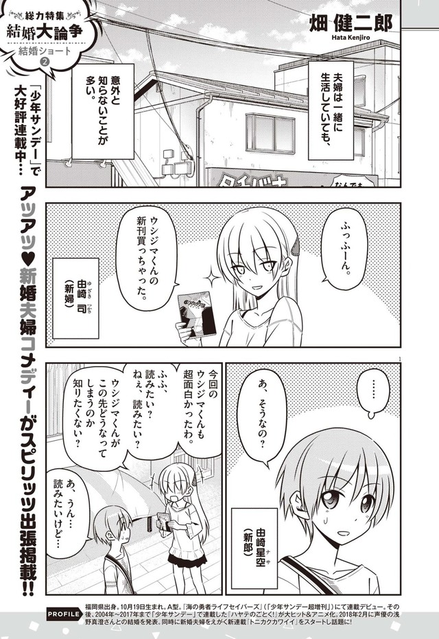 また特集ではさまざまなマンガ家が結婚にまつわるマンガを執筆。2月に声優の浅野真澄との結婚を発表し、週刊少年サンデー(小学館)にて新婚夫婦を描く「トニカクカワイイ」を連載中の畑健二郎による「トニカクカワイイ」特別出張版が掲載されたほか、高橋のぼる、カレー沢薫、岡村星、夏花ナオトのマンガも収録された。