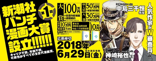 月刊コミックバンチ(新潮社)の刊行を記念し、「新潮社バンチ漫画大賞」が設立された。同賞の特設ページからは、6月29日まで第1回の応募を受け付けている。