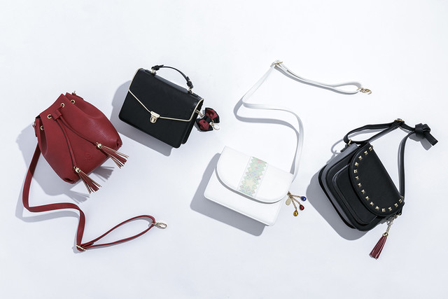 紅月モデルは巾着タイプのショルダーバッグ。ユニットをイメージしたボルドーでまとめられ、内装には紅葉や和雲の総柄があしらわれた。またValkyrieモデルは、ブラックを基調にゴールドのパイピングがアクセントになったシックなハンドバッグ。衣装をイメージしたリボンのバッグチャームも付属する。