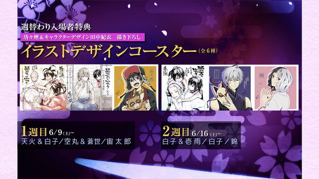 また劇場入場者特典として、原作者の唐々煙、キャラクターデザインの田中紀衣描き下ろしによるコースターの配布も決定。公開1週目、2週目それぞれ各3種のコースターが用意されている。
