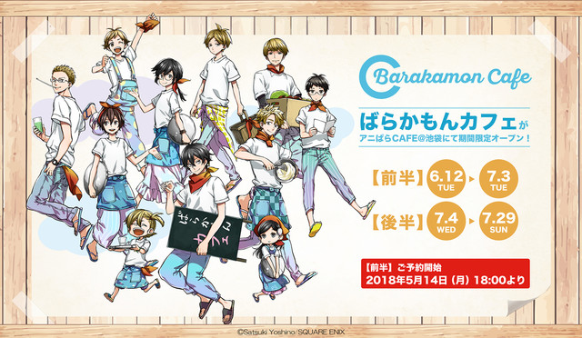また会場には、ヨシノ描き下ろしによる10ページのマンガやインタビューなどが収められた「ばらかもん CAFE BON」や、パタパタメモ帳、エコバッグといったグッズも登場。加えてコラボメニューを1品注文するごとにランダムで1枚、単行本の表紙がデフォルメキャラのイラストで再現されたコースターが進呈される。さらに来店した人全員に、イベントのキービジュアル、もしくは作中に登場する食べ物のシーンを集めたランチョンマットのどちらかをランダムでプレゼント。なお6月12日から7月3日までの期間の予約は、5月14日18時よりカフェ公式サイトにて受け付けられる。
